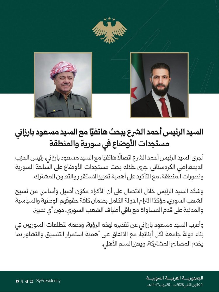 السيد الرئيس أحمد الشرع يبحث هاتفيًا مع السيد مسعود بارزاني مستجدات الأوضاع